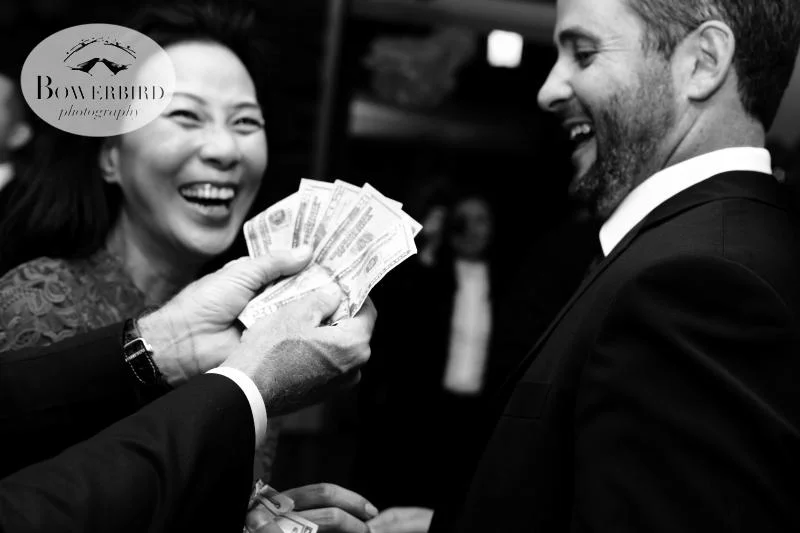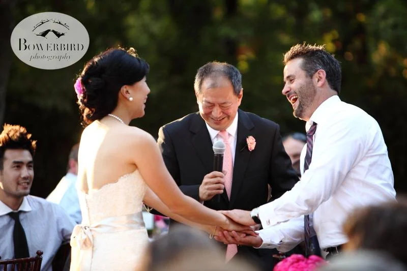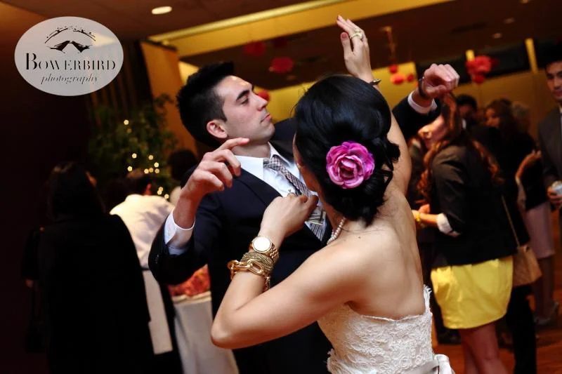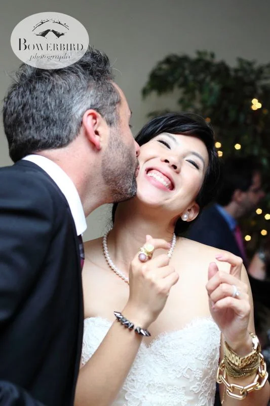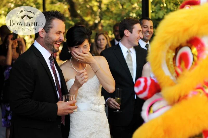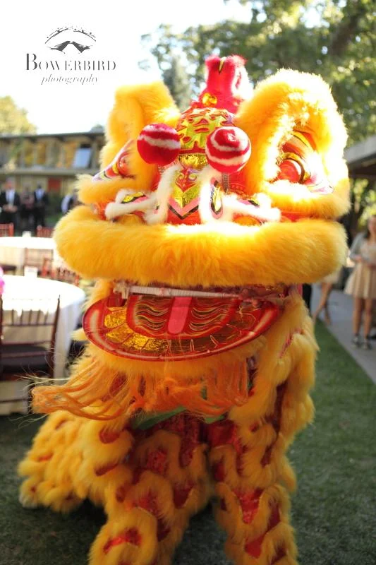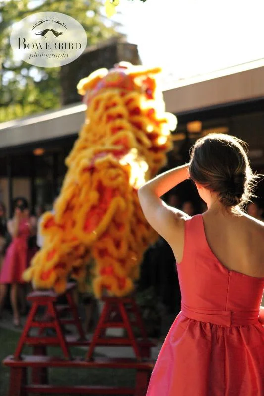 Last week we posted part one of Natalie + Tyler's gorgeous wedding at St. Ignatius Church and we wanted to follow up with part two of their wedding reception at the Marin Art and Garden Center in Ross. Actually, it comes right in time, to help you get in the mood for Chinese New Year starting this Sunday. Guests arrived at the gardens for a surprise Chinese Lion Dance. The lion leaped around to the beat of drums, mischievously biting guests' hands, asking for a good scratch, and performing amazing acrobatics. It was a definite crowd pleaser. Afterwards, guests enjoyed cocktails on the patio with a live jazz band. Dinner was outside, under a beautiful canopy of trees, followed by delicious wedding cake and late night dancing. The whole day had such great energy and you could tell that everyone had a really great time!