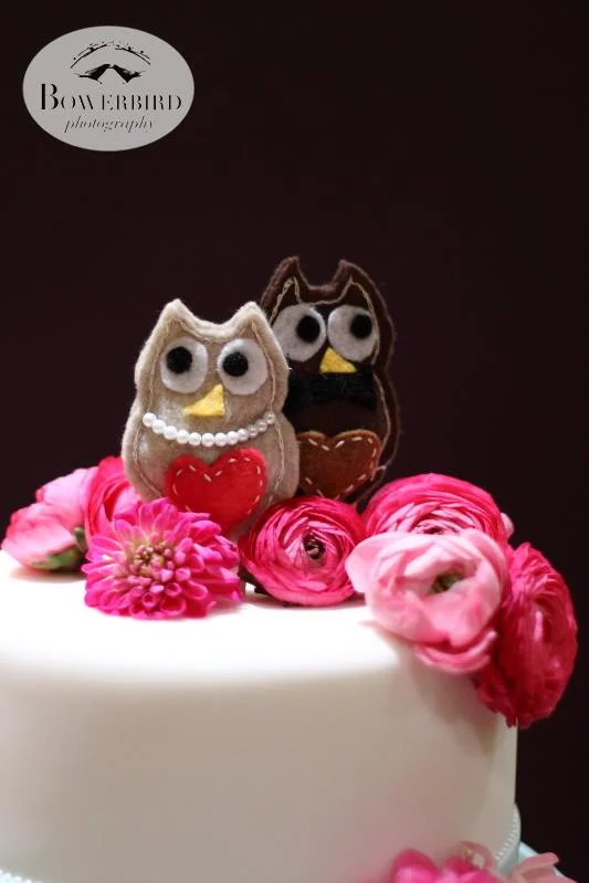 Cute owl cake toppers that the bride made herself :) © Bowerbird Photography 2013; Marin Art and Garden Center Wedding, Ross, CA.