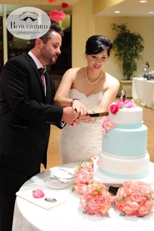 The bride and groom cutting their elegant wedding cake. © Bowerbird Photography 2013; Marin Art and Garden Center Wedding, Ross, CA.